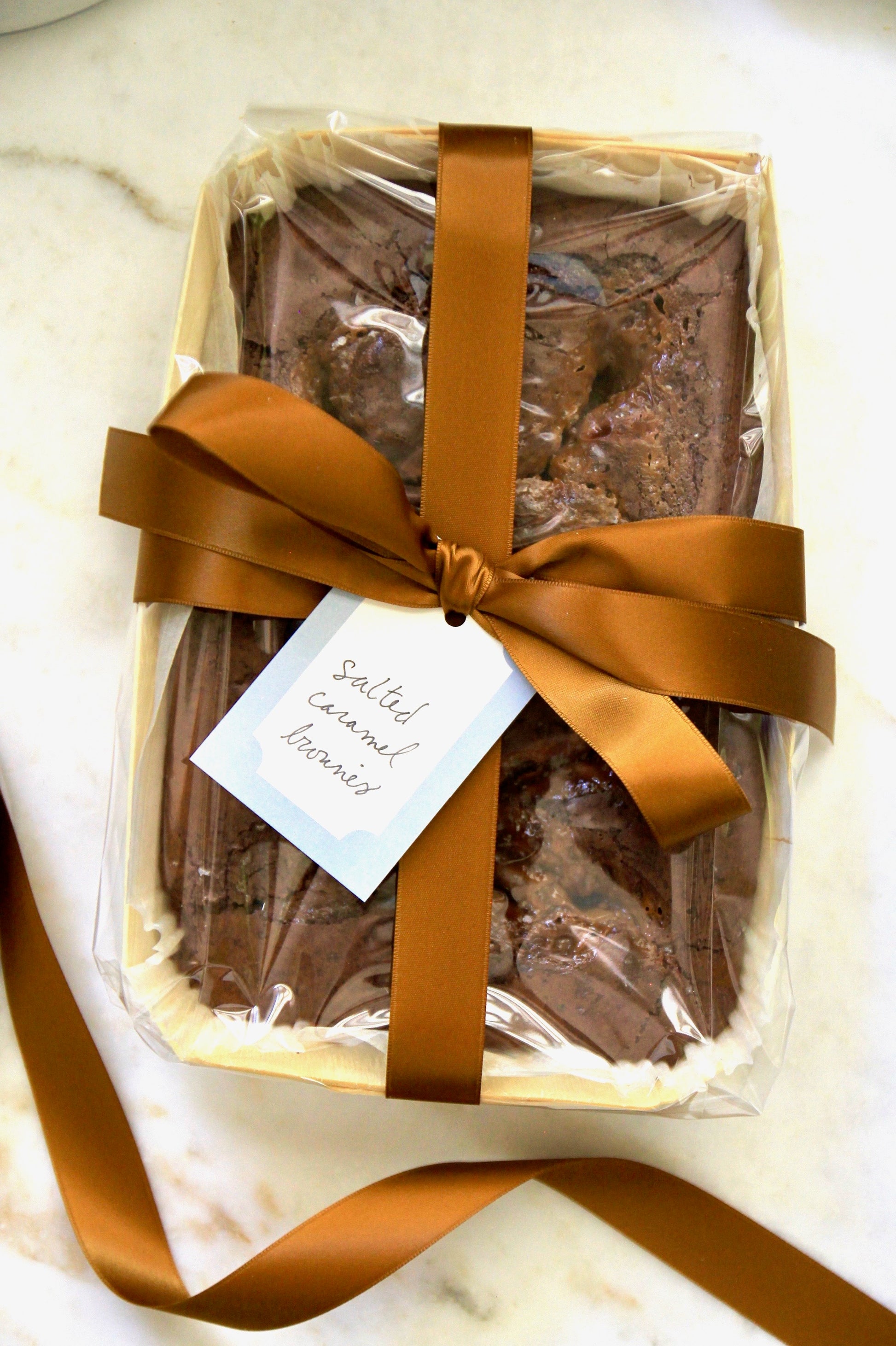 I came across this example while on our trip to England - classic Brownies (from a box mix!) with (store-bought) caramel sauce poured over and sprinkled with sea salt. Packaged in this baking basket plus a Large Cello Bag makes a great gift.