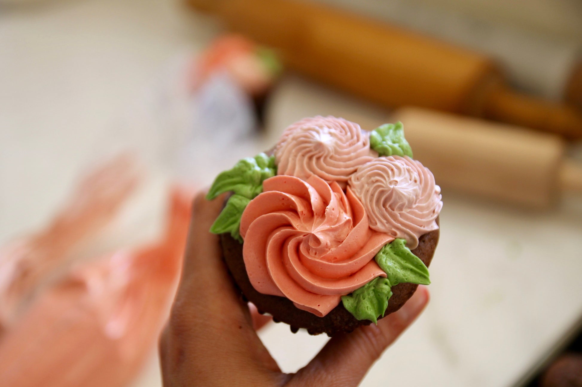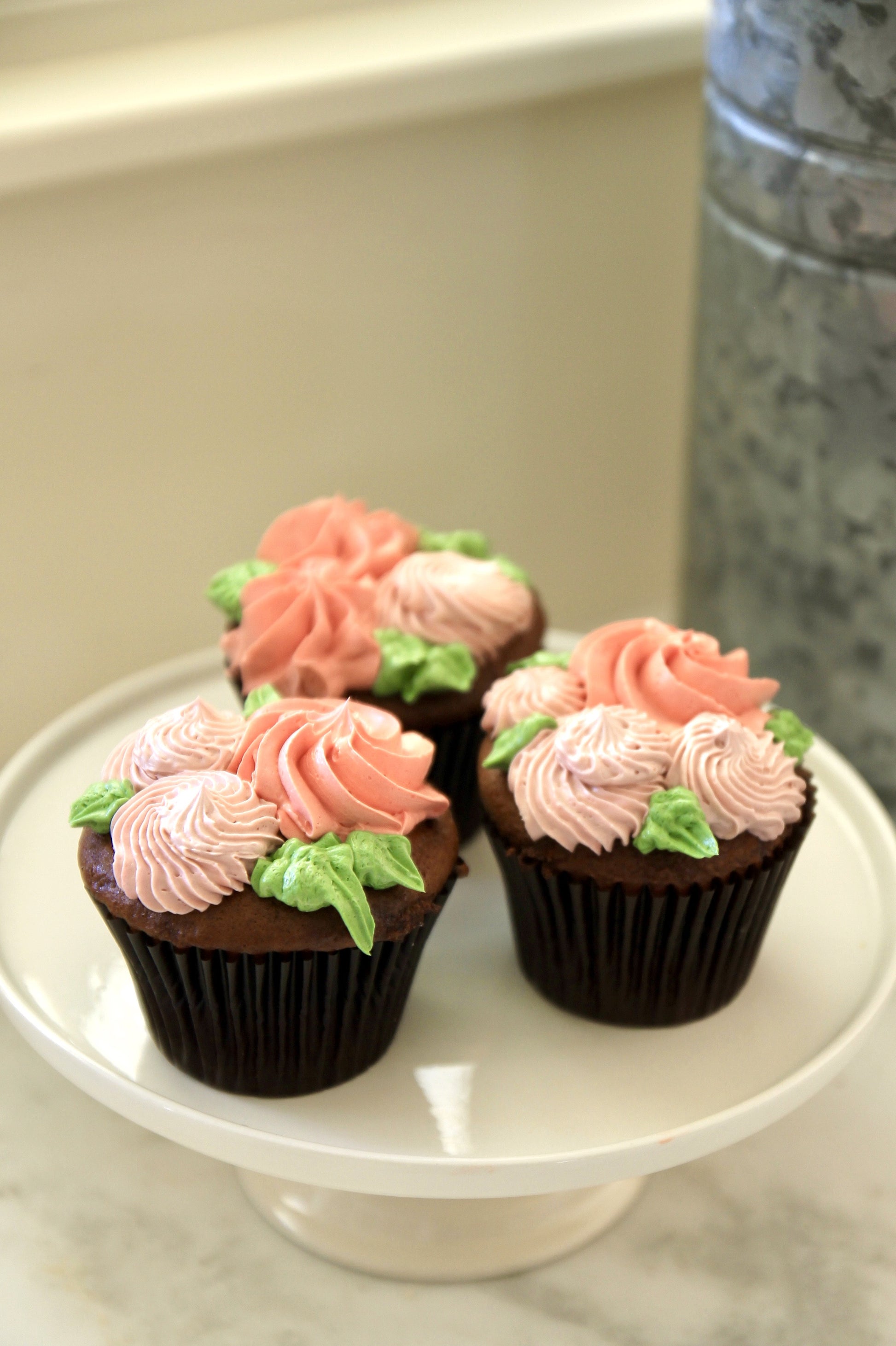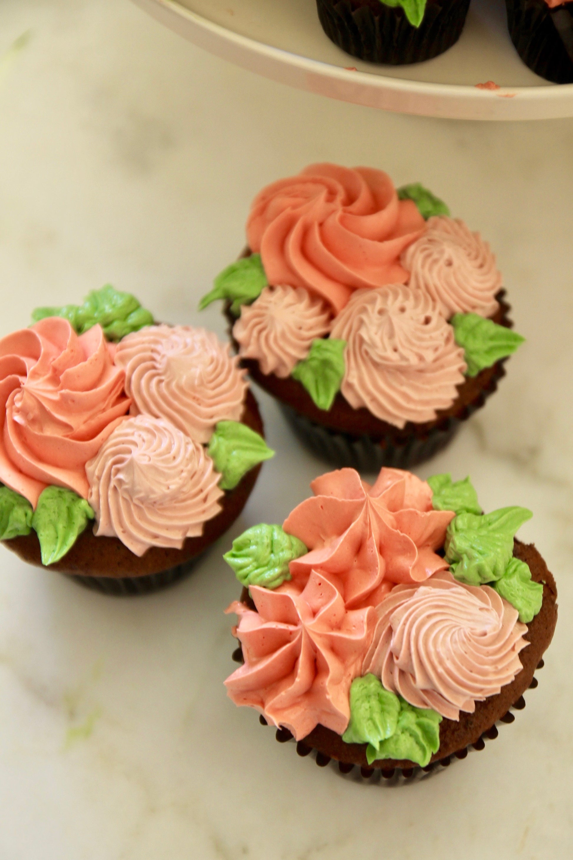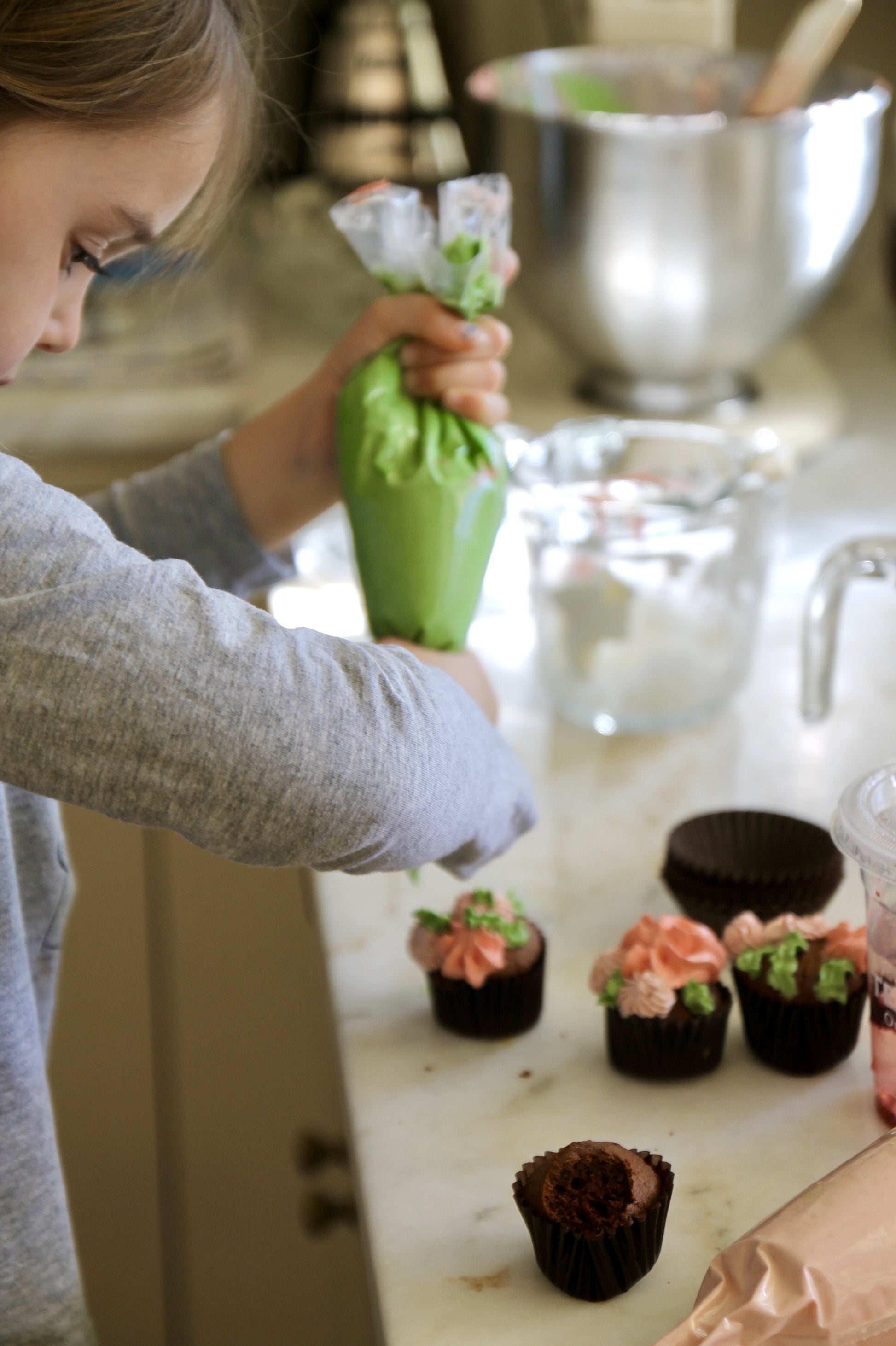We recently did a little pop-up shop and the pastry chef at the venue created darling flower garden cupcakes topped with multiple flowers and leaves. I thought they were so adorable - and how perfect for Mother's Day. They were so, so simple to make - even Emma was turning out great looking tiny gardens. You can do any color scheme, but I loved these coral peony and rose colors.