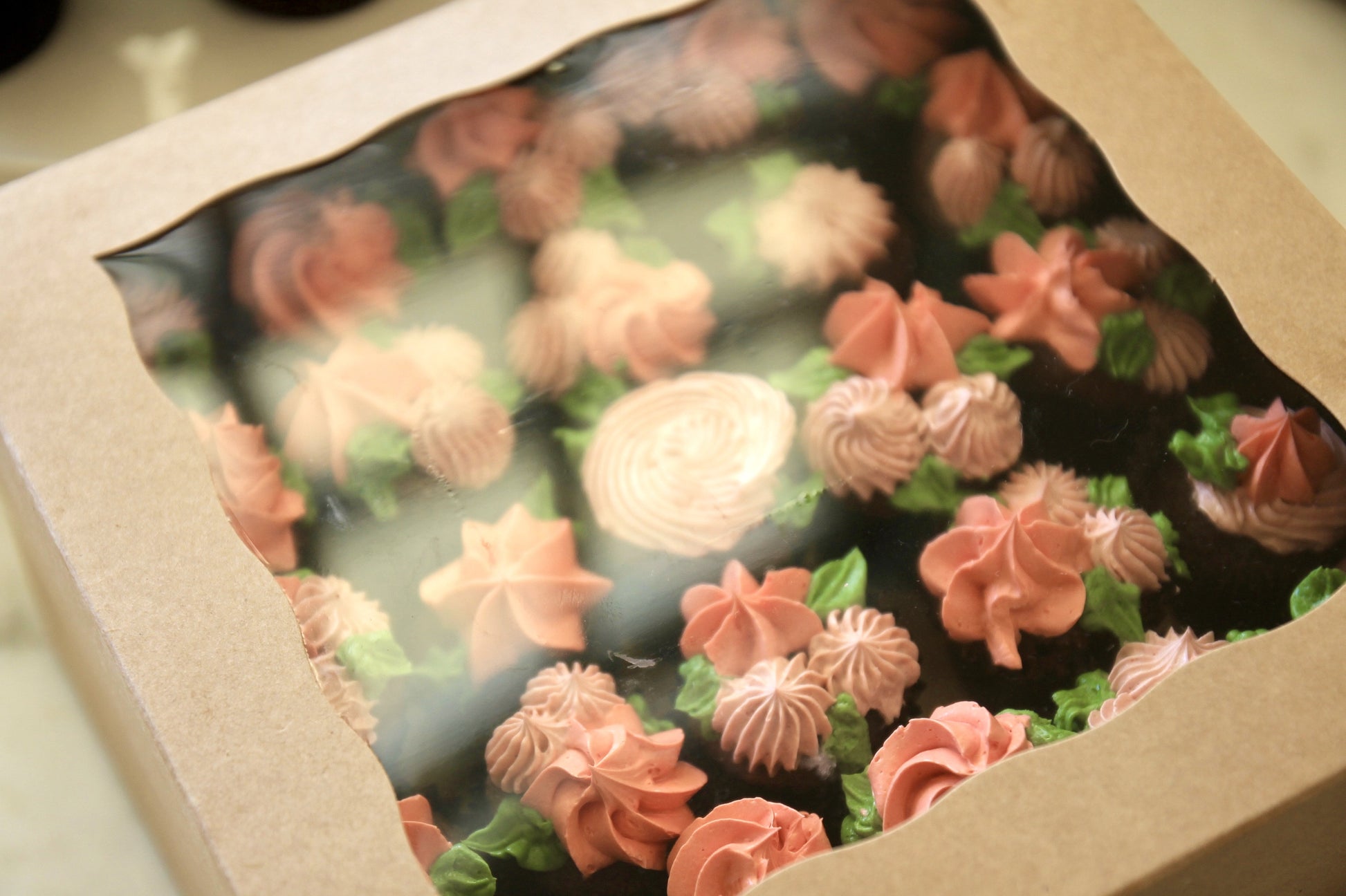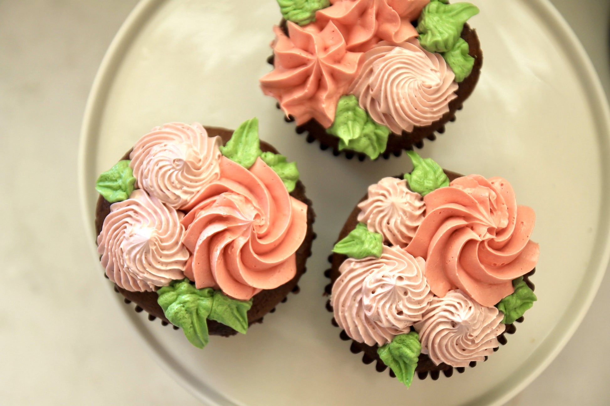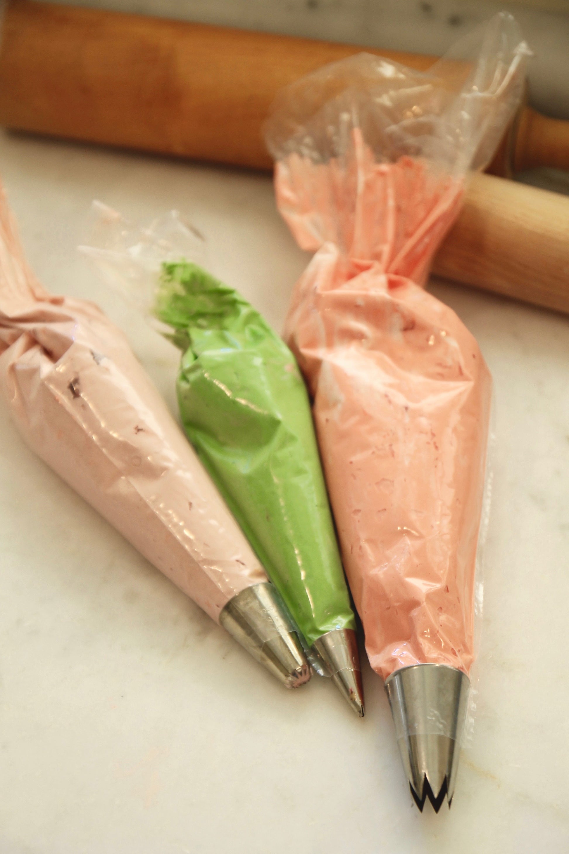 We recently did a little pop-up shop and the pastry chef at the venue created darling flower garden cupcakes topped with multiple flowers and leaves. I thought they were so adorable - and how perfect for Mother's Day. They were so, so simple to make - even Emma was turning out great looking tiny gardens. You can do any color scheme, but I loved these coral peony and rose colors.