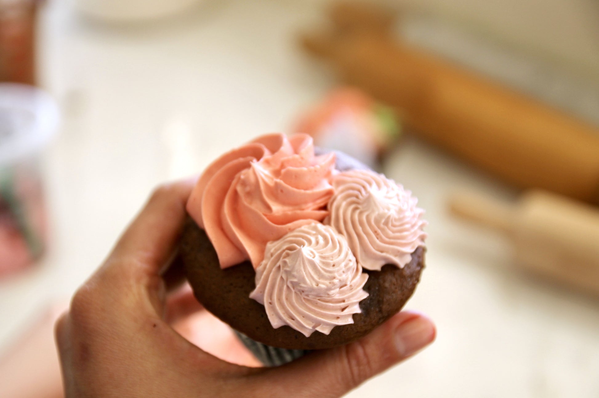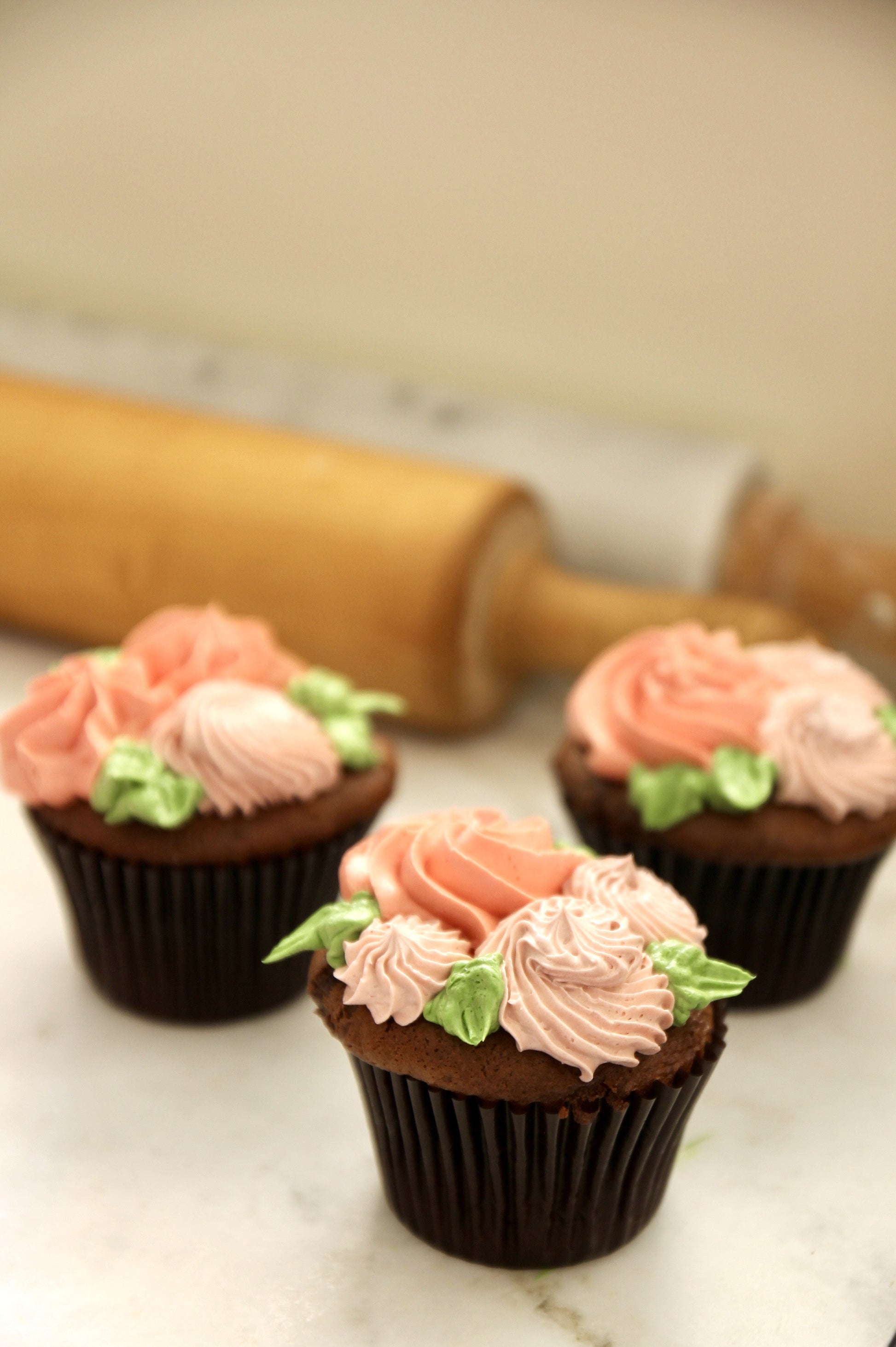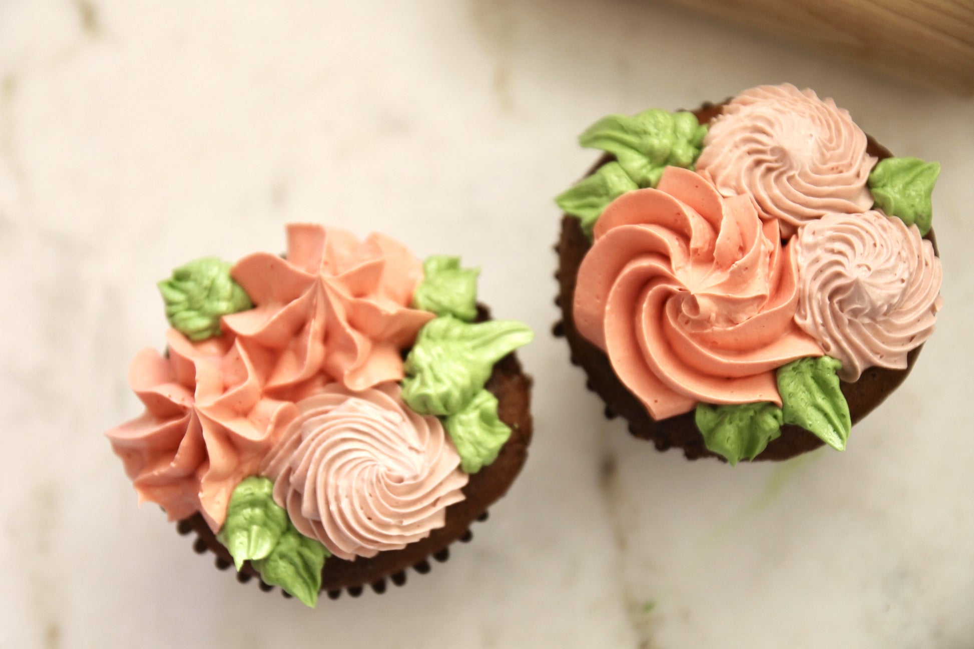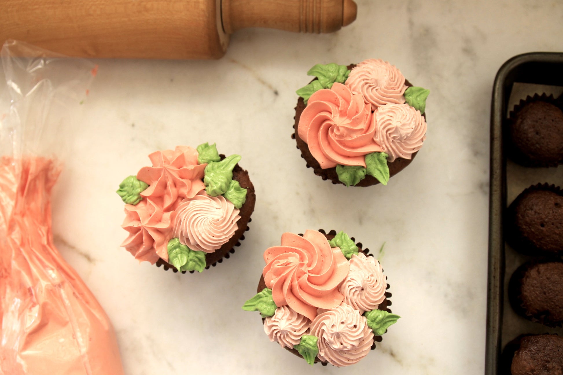 We recently did a little pop-up shop and the pastry chef at the venue created darling flower garden cupcakes topped with multiple flowers and leaves. I thought they were so adorable - and how perfect for Mother's Day. They were so, so simple to make - even Emma was turning out great looking tiny gardens. You can do any color scheme, but I loved these coral peony and rose colors.